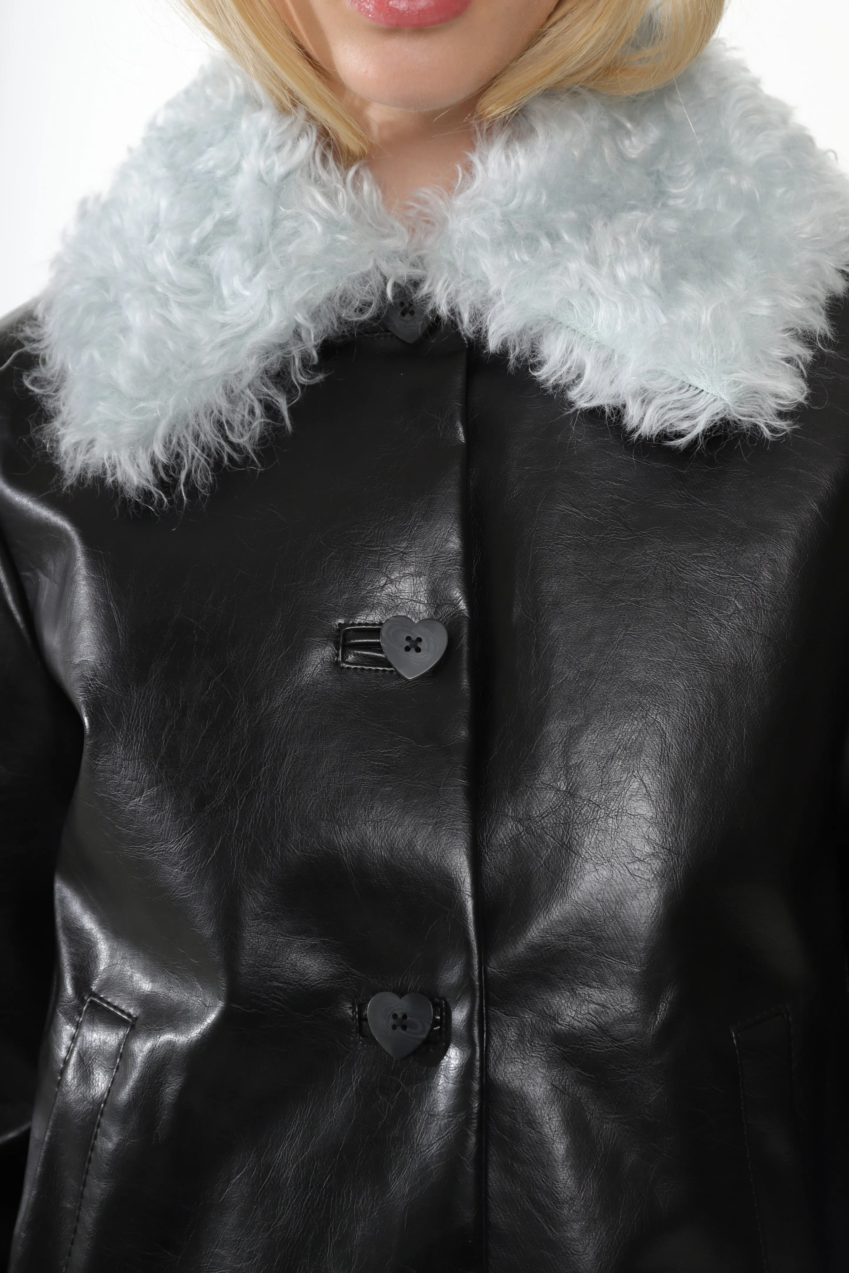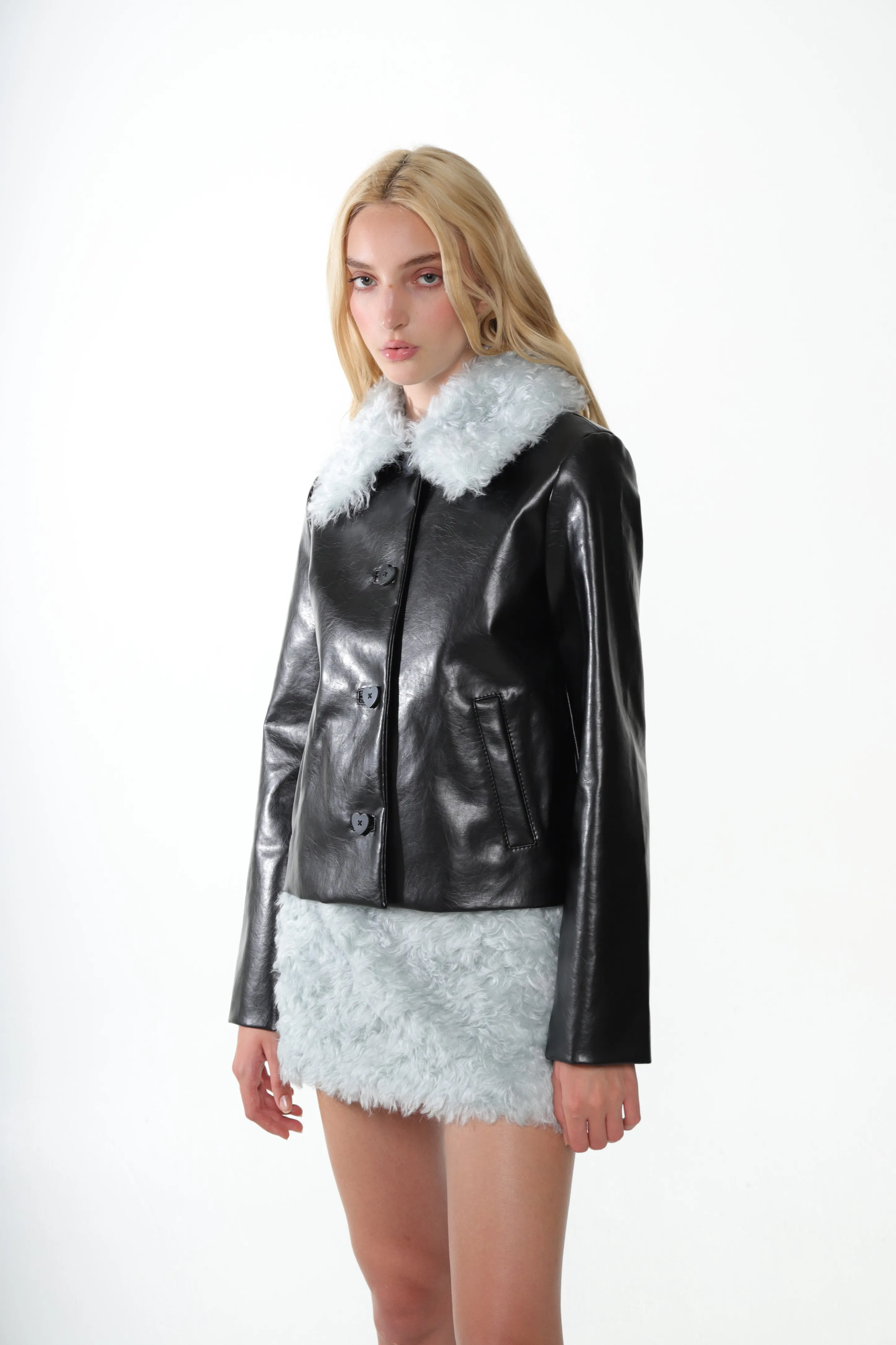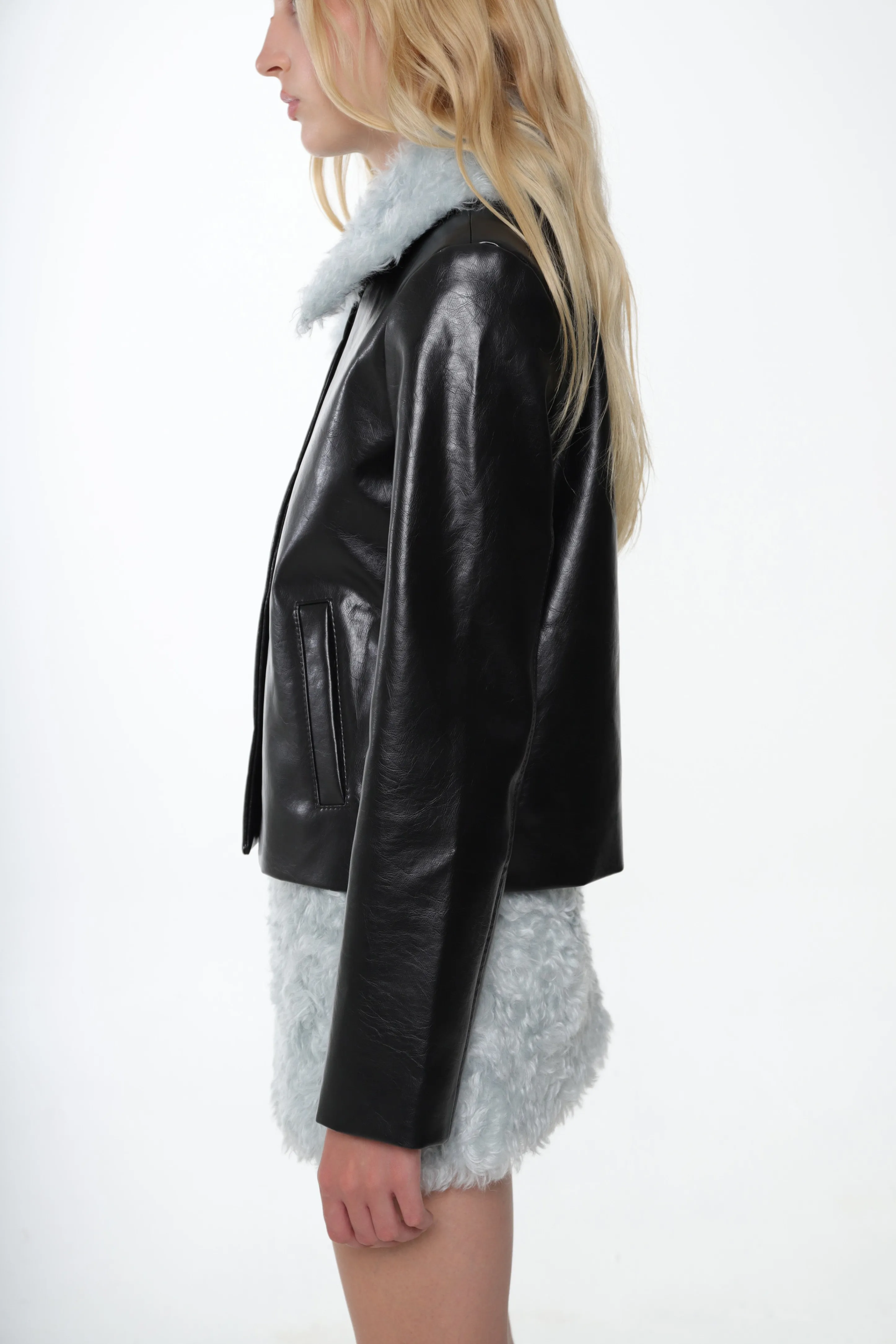 Black faux leather jacket with Ice Blue mohair collar